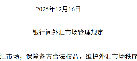 《银行间外汇市场管理规定》已经2025年12月4日中国人民银行第17次行务会议审议通过,现予以发布,自2026年2月1日起施行。...