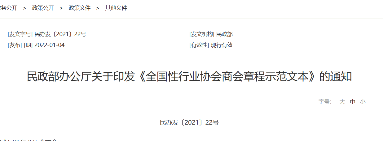 根据《社会团体登记管理条例》等法规政策,民政部制定了《全国性行业协会商会章程示范文本》,现印发给你们,请结合实际认真贯彻执行。各全国性行业协会商会要依据示范文本修改章程,强化规则意识,做到依章程办事...