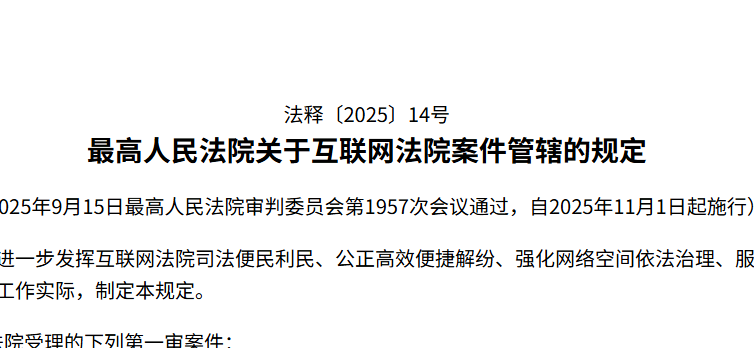 为加强互联网法院建设,优化完善互联网法院的案件管辖,进一步发挥互联网法院司法便民利民、公正高效便捷解纷、强化网络空间依法治理、服务保障数字经济健康发展的功能作用,根据《中华人民共和国民事诉讼法》、...