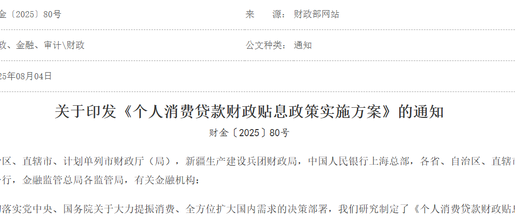为贯彻落实党中央和国务院关于大力提振消费、全方位扩大国内需求的决策部署,根据中央办公厅、国务院办公厅印发的《提振消费专项行动方案》关于2025年对符合条件的个人消费贷款给予财政贴息的要求...