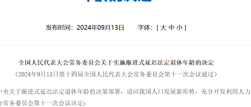 为了深入贯彻落实党中央关于渐进式延迟法定退休年龄的决策部署,适应我国人口发展新形势,充分开发利用人力资源,根据宪法,第十四届全国人民代表大会常务委员会第十一次会议决定:...