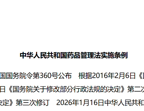 《中华人民共和国药品管理法实施条例》已经2025年12月31日国务院第76次常务会议修订通过,现予公布,自2026年5月15日起施行。...