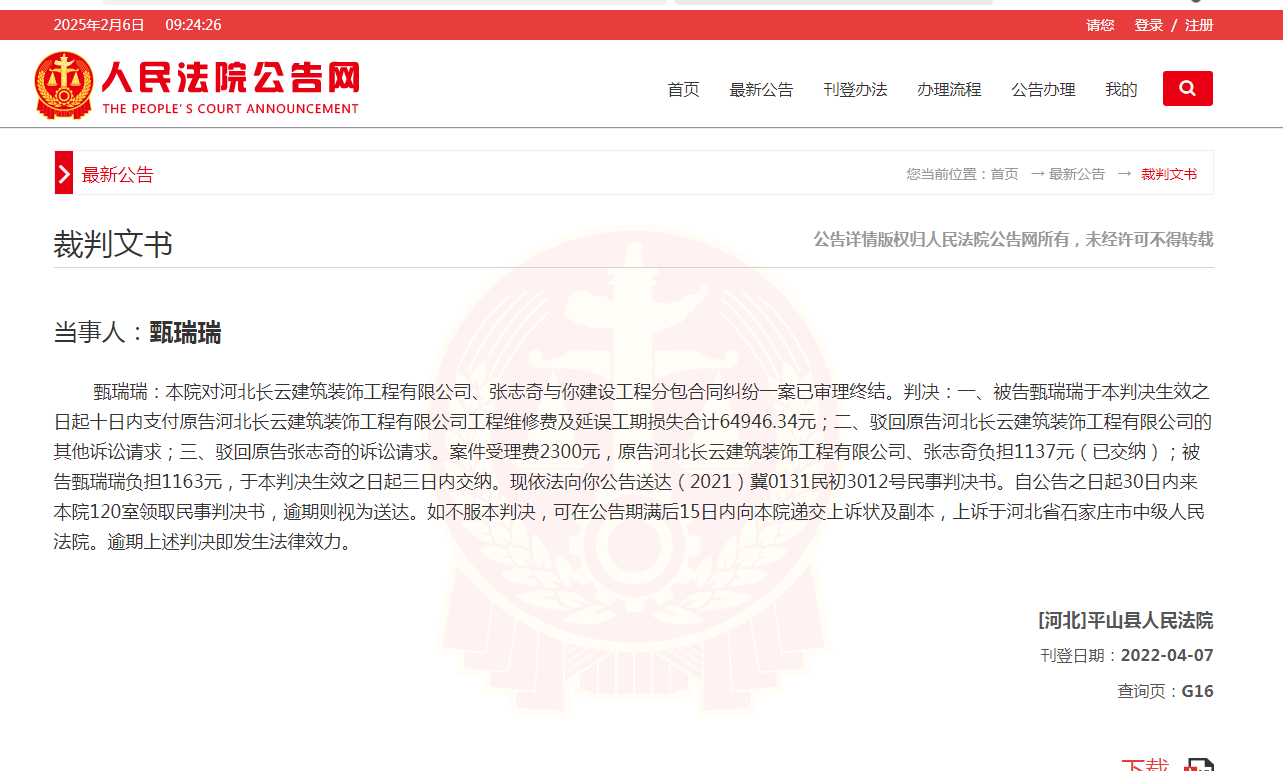 甄瑞瑞:本院对河北长云建筑装饰工程有限公司、张志奇与你建设工程分包合同纠纷一案已审理终结。判决:一、被告甄瑞瑞于本判决生效之日起十日内支付原告河北长云建筑装饰工程有限公司工程维修费及延误工期损失合计6...
