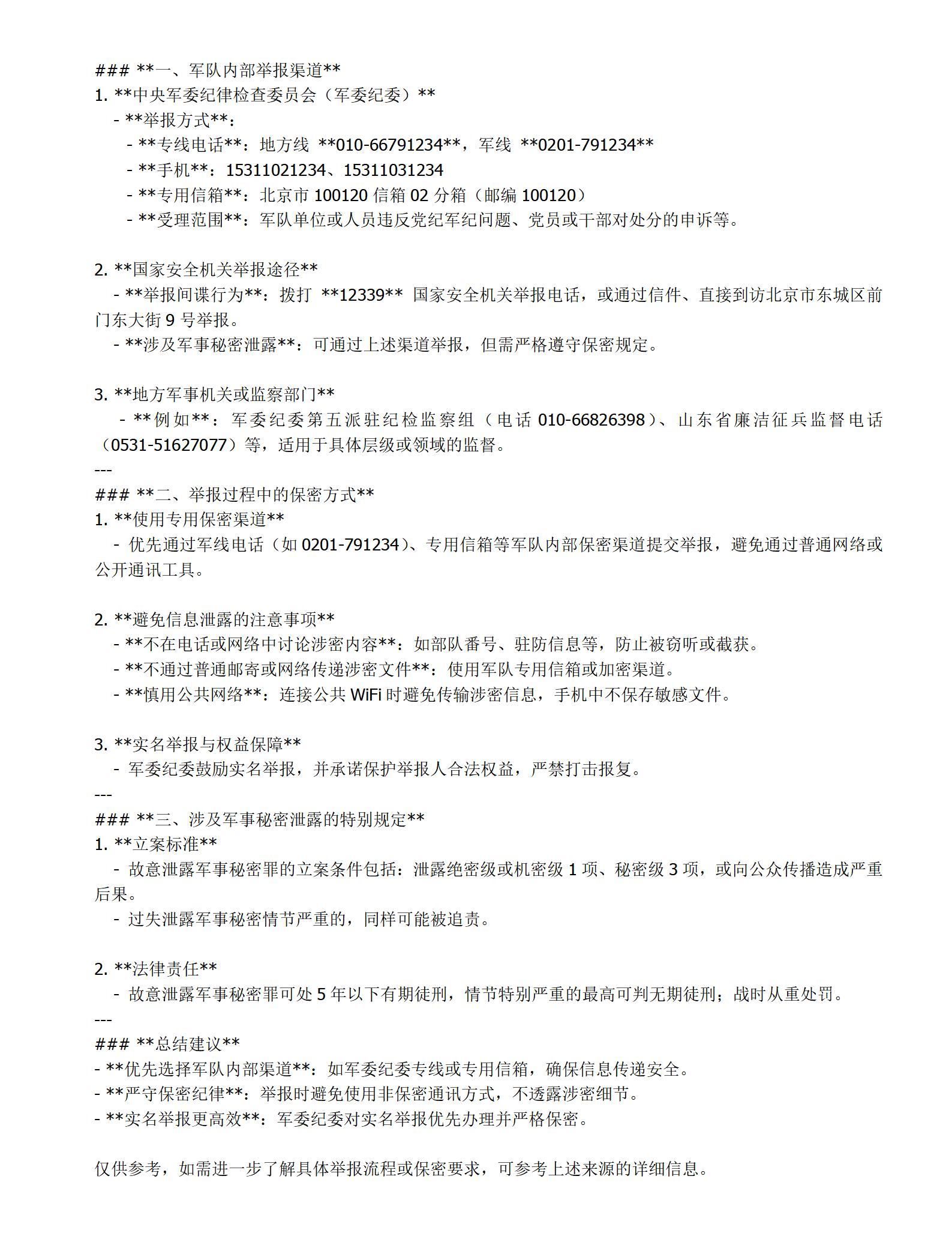### **一、军队内部举报渠道** 1. **中央军委纪律检查委员会(军委纪委)** - **举报方式**: - **专线电话**:地方线 **010-66791234**,军线 **0201-791234** - **手机**:15311021234、15311031234 - **专用信箱**:北京市100120信箱02分箱(邮编100120) ....