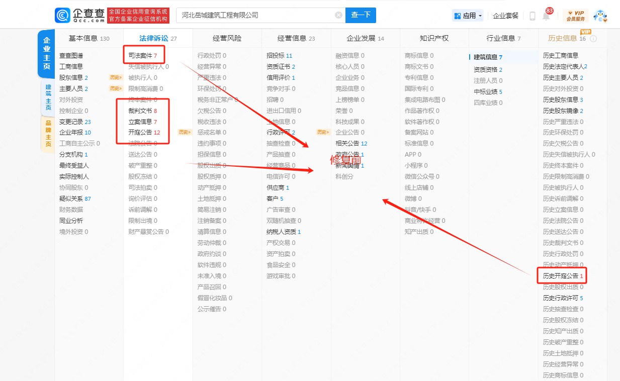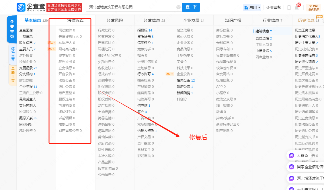法律文书、行政处罚、失信被执行人、限制高消费等负面信息通过信用修复已全部停止对外公示,大大提升了企业品牌价值。
