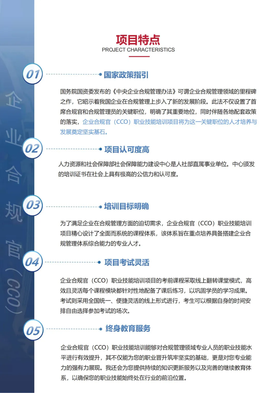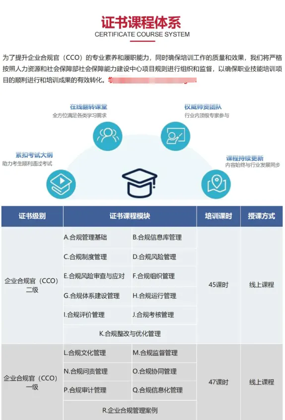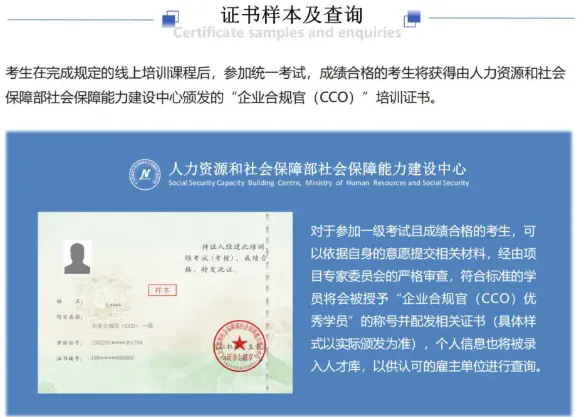 企业合规官(简称CCO)是人力资源和社会保障部社会保障能力建设中心主办开展企业合规官(CCO)职业技能培训项目;凡参加培训并考核合格者,由人力资源和社会保障部社会保障能力建设中心颁发企业合规官(CCO)培训证书,证书信息可在人力资源和社会保障部教育培训官网查询。