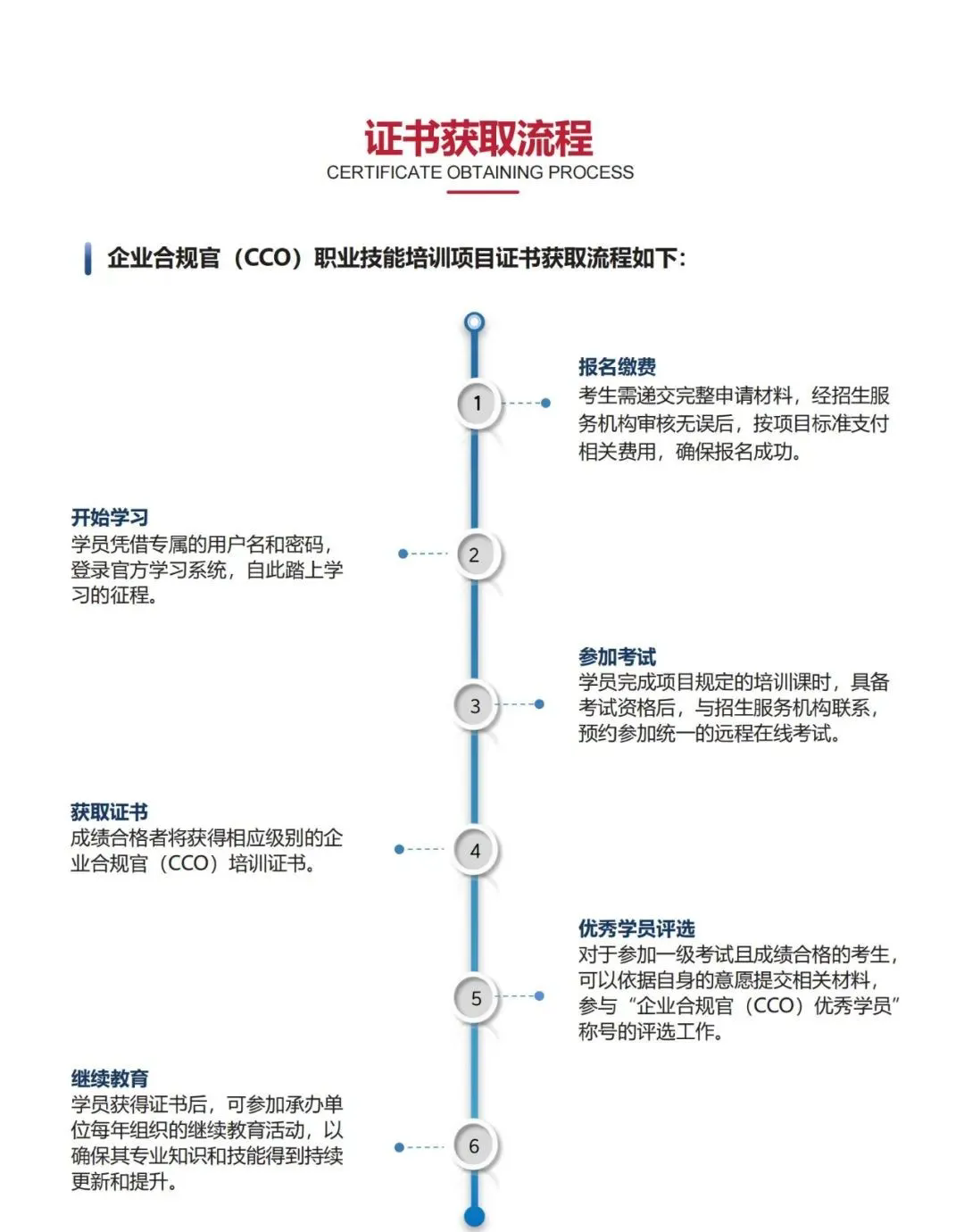 六、培训证书发放参加培训并通过考核的学员,将获得人力资源和社会保障部社会保障能力建设中心颁发的企业合规官(CCO)培训证书。证书可在人力资源和社会保障部教育培训网进行查询。七、报名及联系方式(一)报名材料及要求:1.填写报名审核表(联系报名咨询老师或地方招生服务机构索取);2.最高学历证、经济类职称证和身份证正反面复印件电子版3.提交以本人身份证号命名(X使用大写)的格式为.JPG的个人近期免冠电子照片。建议照片尺寸为33mm(高)×23mm(宽),大小在20KB-150KB之间,白底,确保人像清晰。