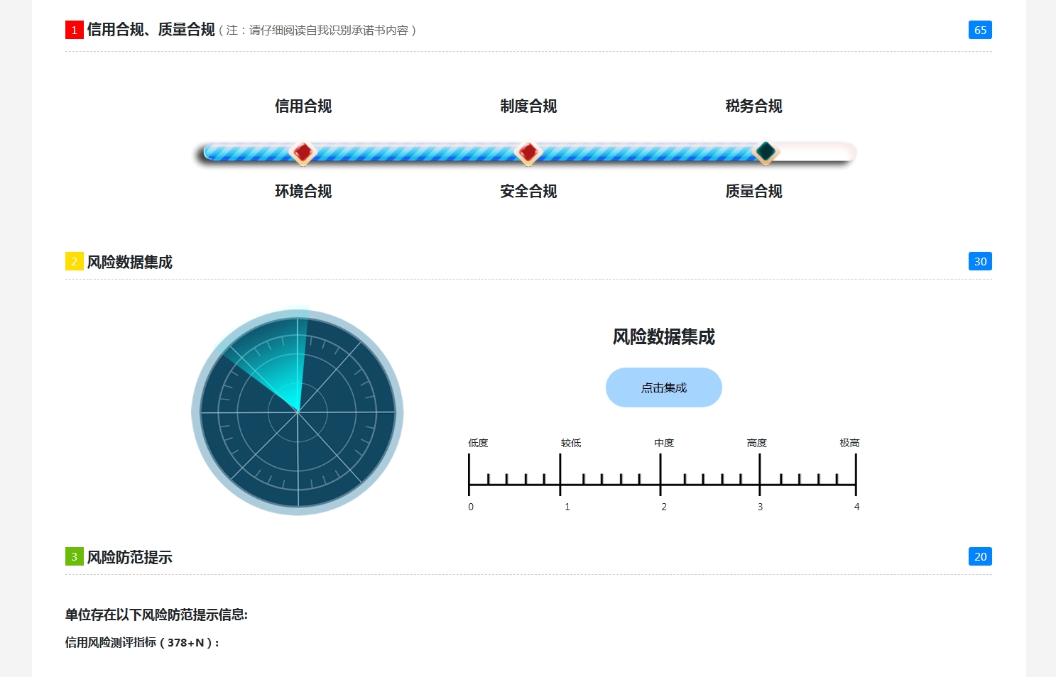 合规风险测评是利用大数据智能分析企业信用合规、制度合规、税务合规、环境合规、安全合规、质量合规等方面指标,最后出具比较权威的信用合规报告,使决策者一目了然知道自己企业的不合规之处。有关测评操作界面如下: